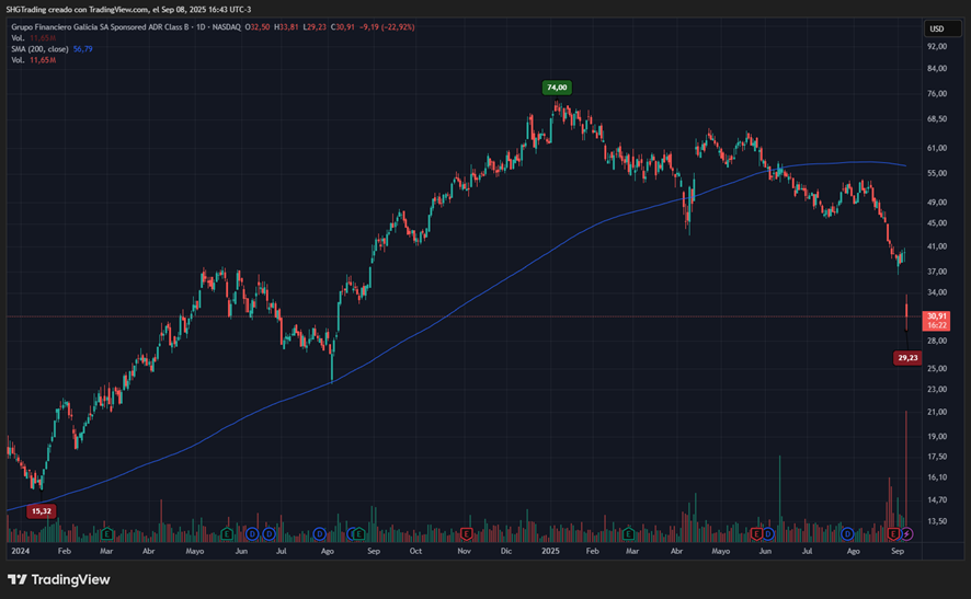En papeles puntuales como Banco Galicia (GGAL), el derrumbe fue aún más fuerte: de USD 74 en enero hasta el mínimo intradiario de USD 29,23 hoy, con un retroceso de -60,5%.