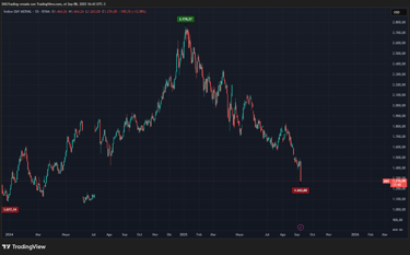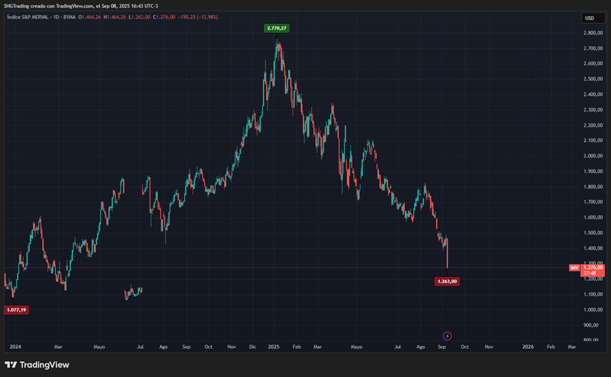 Desde los máximos de enero 2025, cuando el índice Merval alcanzó los USD 2.770 (07/01/2025), hasta el mínimo de hoy en USD 1.263, la pérdida medida en dólares asciende a -54%, según el tipo de cambio de referencia de TradingView para las cotizaciones en pesos argentinos.