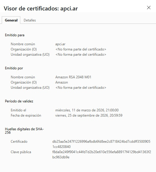 [Imagen 3 – Certificado SSL del sitio apci.ar: genérico y emitido sin identificación de organismo público]