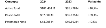 El pasivo total aumentó +59,1%, especialmente el pasivo corriente +60,6%, mostrando mayor endeudamiento de corto plazo.