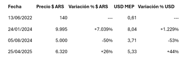 Desde este mínimo relativo en $ ARS 5.000 (USD 3,71 al MEP del 5/08/2024), la acción subió hasta los $ ARS 6.320 del 25/04/2025, que en virtud de la apreciación del peso argentino frente al dólar estadounidense alcanzó una suba del 44% (USD 5,33) considerando el dólar MEP.