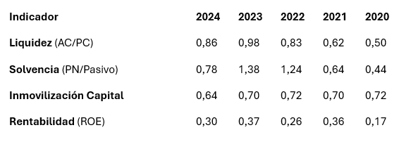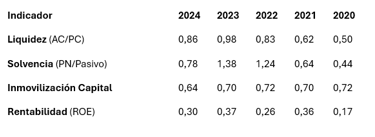 Solvencia: Fuerte caída de 1,38 a 0,78, indica mayor presión de deuda sobre el patrimonio.