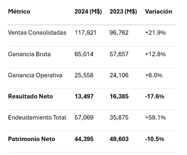 Si bien la ganancia bruta fue +12,8%, y la operativa +6,0%, aumentando entre 2024 y 2023, el resultado neto presentó una disminución del -17,6%.