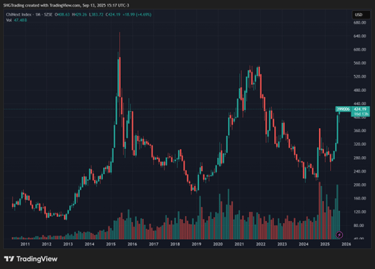 Está compuesto por aproximadamente 100 empresas, cotiza en RMB, con fuerte participación de inversores minoristas chinos, y alta volatilidad (movimientos intradiarios del 5% pueden ser habituales). Te mostramos la evolución del índice desde 2011, convertido a USD.