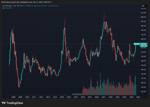 Es el benchmark preferido de los grandes fondos institucionales porque combina lo onshore y lo offshore. Su cobertura es más fiel a la economía china en su conjunto, aunque arrastra riesgos geopolíticos (por ejemplo, la amenaza de delisting de ADRs en EE.UU.).