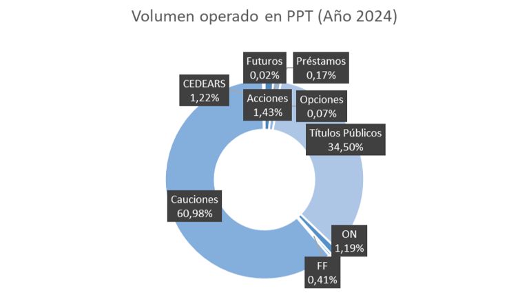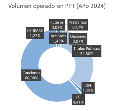 En PPT (el ámbito más familiar para el minorista), el negocio estuvo abrumadoramente orientado a tasa (≈97,3% entre cauciones y deuda) y muy poco a riesgo accionario (≈2,7%): Acciones 1,43%, CEDEARs 1,22%, Opciones 0,07%.