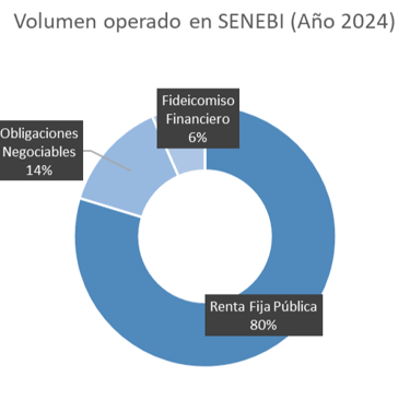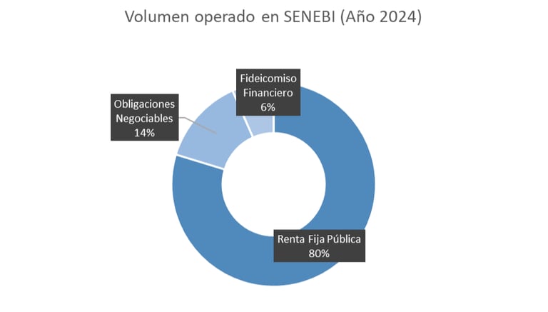 Dentro de SENEBI, la concentración fue claramente soberana: Títulos Públicos 79,7%, Obligaciones Negociables (ON) 13,7% y Fideicomisos Financieros (FF) 6,6%.